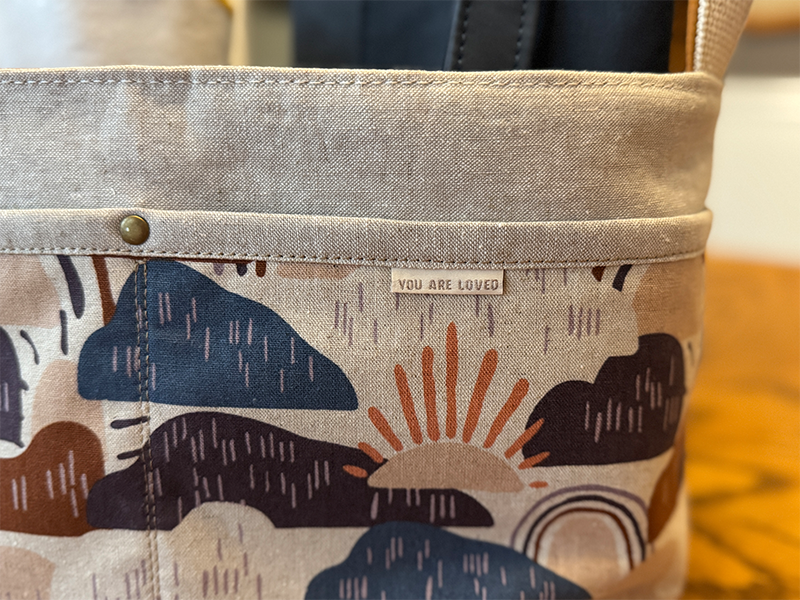 Inside is a Clean-up Clutch (with space for wipes, diapers, a zipper pouch and changing pad), a blanket, and a few goodies. Couldn’t pass up the You Are Loved tag.