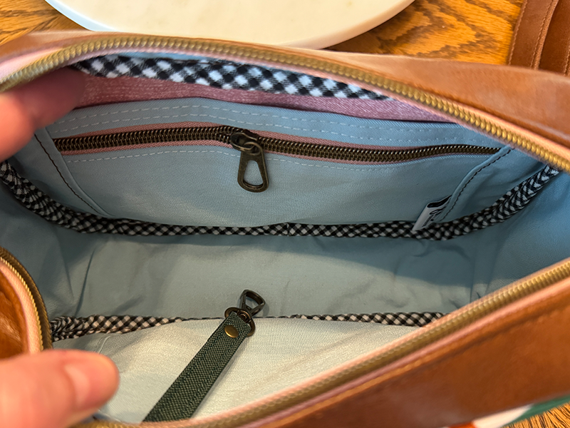 I added a snap/slip pocket instead of card slots. There’s also a zipper pocket and additional slip pocket inside as well as a slip pocket on the outside in between the sling connectors – so many options!Â