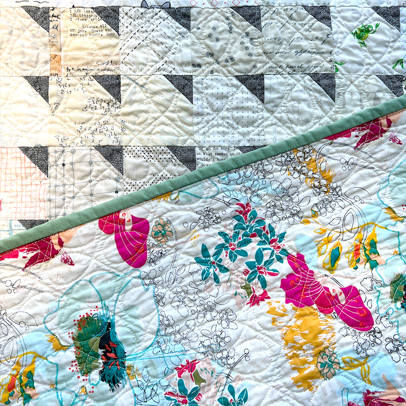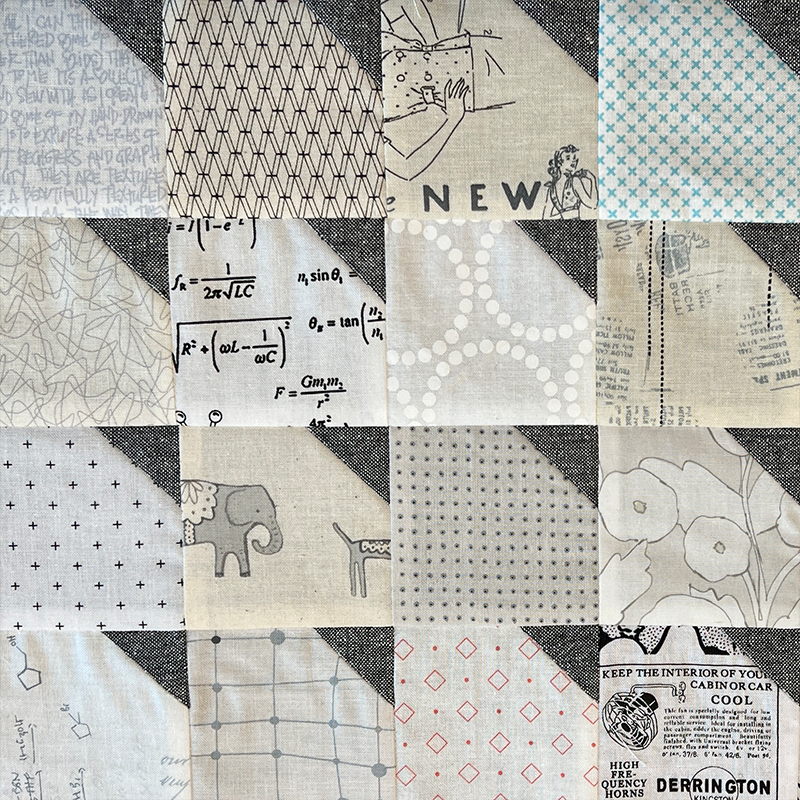Inspired by an I-spy quilt I saw online, I used 3″ squares of mostly low volume blenders (a few fussy cuts for good measure) plus triangles made fromĀ Fabrics Essex Yarn Dyed Charcoal.Ā