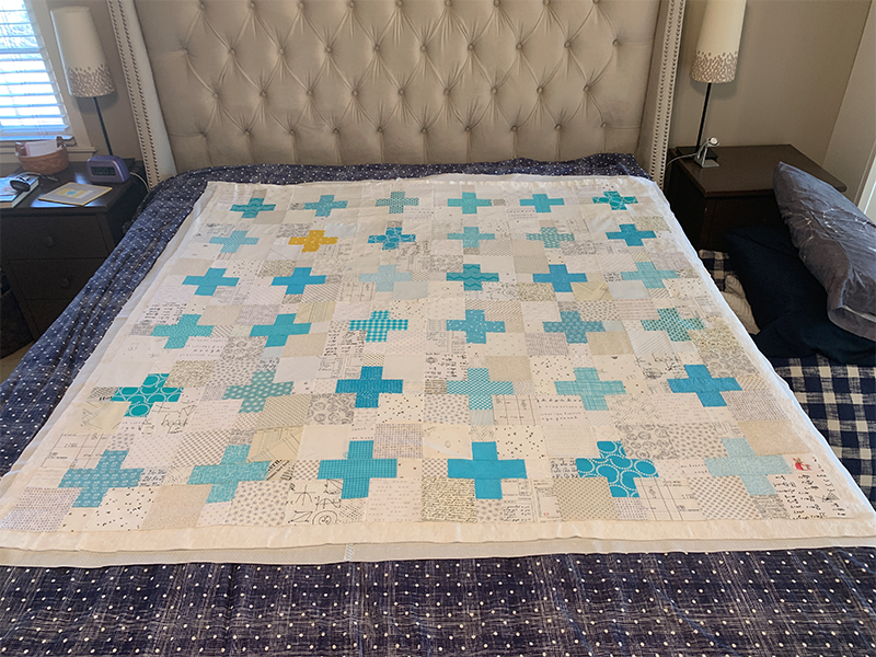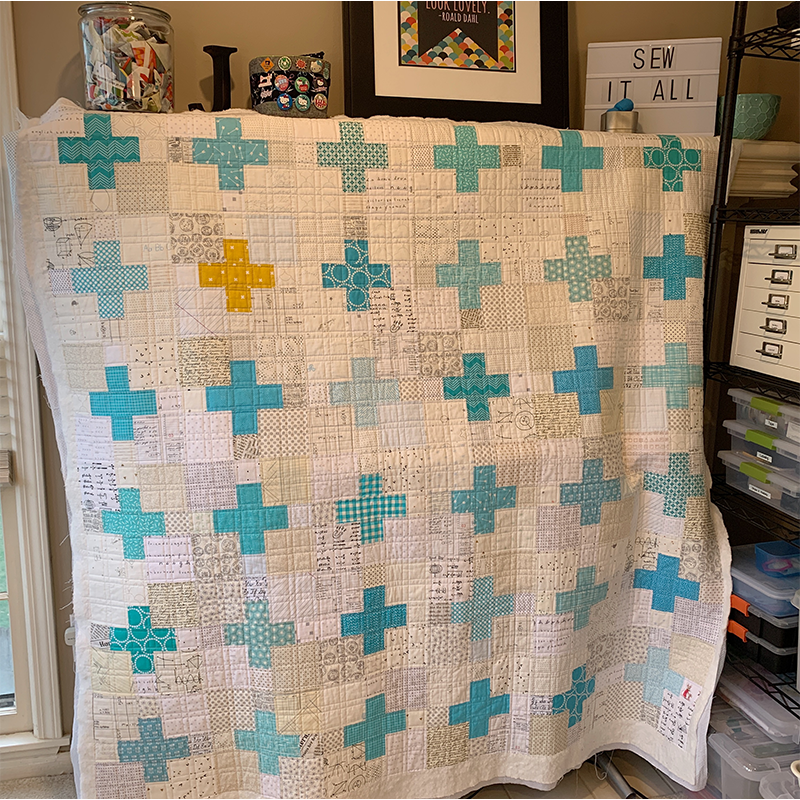 This low-volume ➕ quilt is my own design based off many other standard plus blocks. Finished size: 60″x60″. I’m calling it “Positive Impact.”⁠⠀I straight-line quilted this one myself.