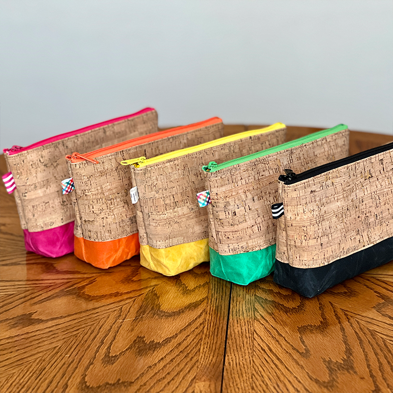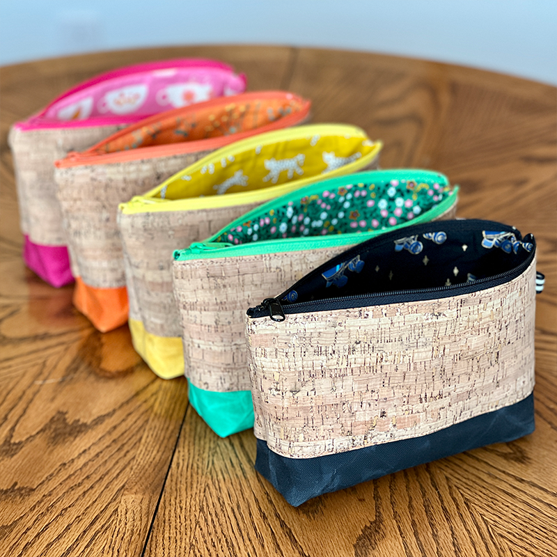 🌈 Just finished 5 zippy pouches for a custom order! Cork and waxed canvas for the exterior with a variety of cotton prints inside.