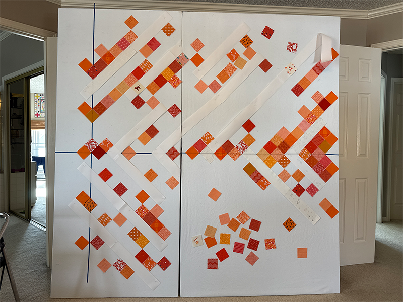 This is the Erica quilt by Kitchen Table Quilting. I’m so glad I have a design wall as setting blocks on point messes with my brain! 😂 Using strips of low-volume made this come together quickly.