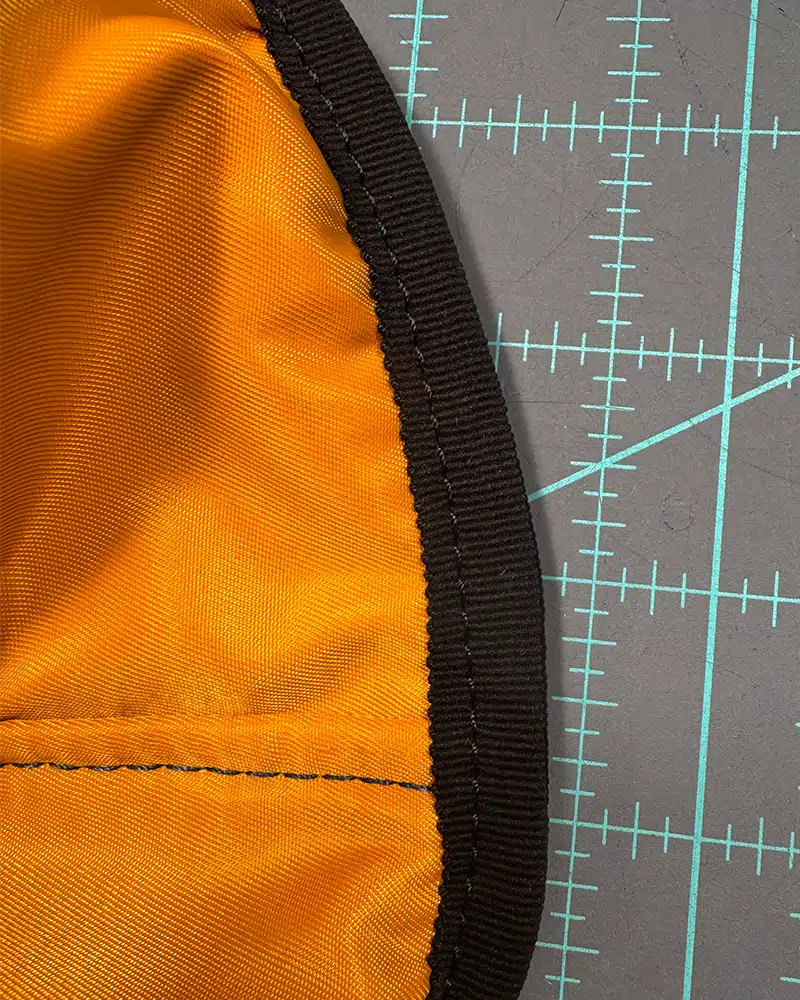 I’ve been hunting for years for a good binding material and I think I’ve found the winner! This was my first time using stretch Petersham and it is absolutely perfect! Just that slight amount of stretch allows it to flow around the curves without bunching. This Petersham has a center line so it folds nicely over the edge so I only have to stitch it on in one pass unlike traditional bias tape with requires two passes. Yay!