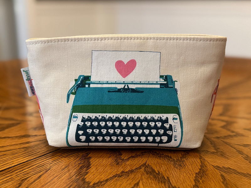I find it hard to visit friends without bringing a little something homemade. We’re headed to Canada soon and this pouch is for a college English professor – this typewriter fabric was calling her name!